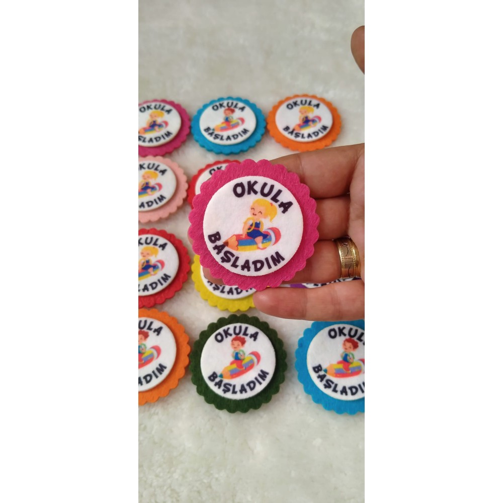 Okula Başladım Temalı Keçe Yaka Rozeti ürünümüz kaliteli kalın keçe üzerine renkli baskı tekniği ile üretilmiştir.